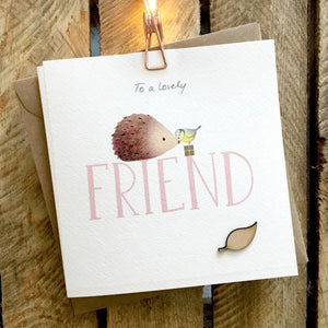 Card featuring a cute hedgehog and blue tit sitting on top of large FRIEND caption. Caption reads "To a lovely FRIEND!" Suitable for Birthdays or just to send to a friend to stay in touch.